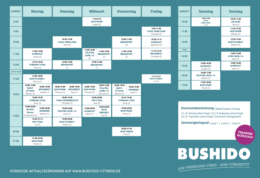 KursplanUnser Kursplan KategorieBodyattackBodycombatBodyjamBodypumpDancePilatesRave-AerobicRehasportRückenfitSpinningStepWorkoutYoga KursleiterAfshinAndreéAnilaChristianeChristophClausDennyGenIsabellJennyJohannaJuliaKathrinLeanderLeniLisaMathiasMoniNinaOxanaPatrickPaulaPiaSebastianTeraThomyThorstenViktoriaYannYvonne Montag Workout 11:00 - 12:00 Kursraum 2 Oxana Iyengar-Yoga 12:10 - 13:40 Kursraum 3 Claus Bodycombat 17:00 - 18:00 Kursraum 2 Patrick RückenFit 18:00 - 19:00 Kursraum 1 Leander Iyengar-Yoga 18:00 - 19:30 Kursraum 3 Claus Bodyattack 18:00 - 19:00 Kursraum 2 Mathias Spinning 19:00 - 20:00 Kursraum 1 Mathias Shuffle Dance 19:00 - 20:00 Kursraum 2 Yvonne Yin-Yoga 19:45 - 21:15 Kursraum 3 Nina Bodypump 21:00 - 22:00 Kursraum 2 Thomy Dienstag Yoga Open Level 10:30 - 12:00 Kursraum 3 Claus Rehasport 12:00 - 13:00 Kursraum 1 RückenFit 18:00 - 19:00 Kursraum 1 Paula Bodypump 18:00 - 19:00 Kursraum 2 Thorsten Yoga Intermediate 18:00 - 19:30 Kursraum 3 Christoph Pilates Level 1-2 19:00 - 20:00 Kursraum 1 Paula Bodycombat 19:00 - 20:00 Kursraum 2 Kathrin Mittwoch Bodypump 07:10 - 08:10 Kursraum 2 Isabell Rehasport 11:00 - 12:00 Kursraum 3 Pilates Level 1-2 11:00 - 12:00 Kursraum 2 Rehasport 12:00 - 13:00 Kursraum 1 Pilates Level 1-2 18:00 - 19:00 Kursraum 1 Christiane Bodypump 18:00 - 19:00 Kursraum 2 Thorsten Yin-Yoga 18:30 - 20:00 Kursraum 3 Julia Workout 19:00 - 20:00 Kursraum 1 Denny Rave-Aerobic 19:00 - 20:00 Kursraum 2 Leni Donnerstag Rehasport 10:00 - 11:00 Kursraum 2 Rehasport 11:00 - 12:00 Kursraum 2 Bodyattack 18:00 - 19:00 Kursraum 2 Mathias Spinning 18:00 - 19:00 Kursraum 1 Anila Iyengar-Yoga 18:15 - 19:45 Kursraum 3 Claus Bodypump 19:00 - 20:00 Kursraum 2 Thomy Jazz-Dance 20:00 - 21:30 Kursraum 2 Tera Freitag Yoga Open Level 09:30 - 11:00 Kursraum 3 Christoph Workout 10:30 - 11:15 Kursraum 2 Sebastian RückenFit 11:15 - 12:15 Kursraum 2 Christoph Bodycombat 17:15 - 18:15 Kursraum 2 Lisa Samstag Yoga Open Level 10:30 - 12:00 Kursraum 3 Pia Workout 15:00 - 16:00 Kursraum 2 Leander Pilates Level 1-2 16:00 - 17:00 Kursraum 2 Viktoria Bodypump 17:00 - 18:00 Kursraum 2 Thomy Sonntag LMI STEP 10:45 - 11:45 Kursraum 2 Yann Bodypump 11:45 - 12:45 Kursraum 2 Mathias Bodycombat 12:45 - 13:45 Kursraum 2 Mathias Step Level 1-2 14:00 - 15:00 Kursraum 2 Moni Workout 15:00 - 16:00 Kursraum 2 Moniteilen teilen teilen E-Mail